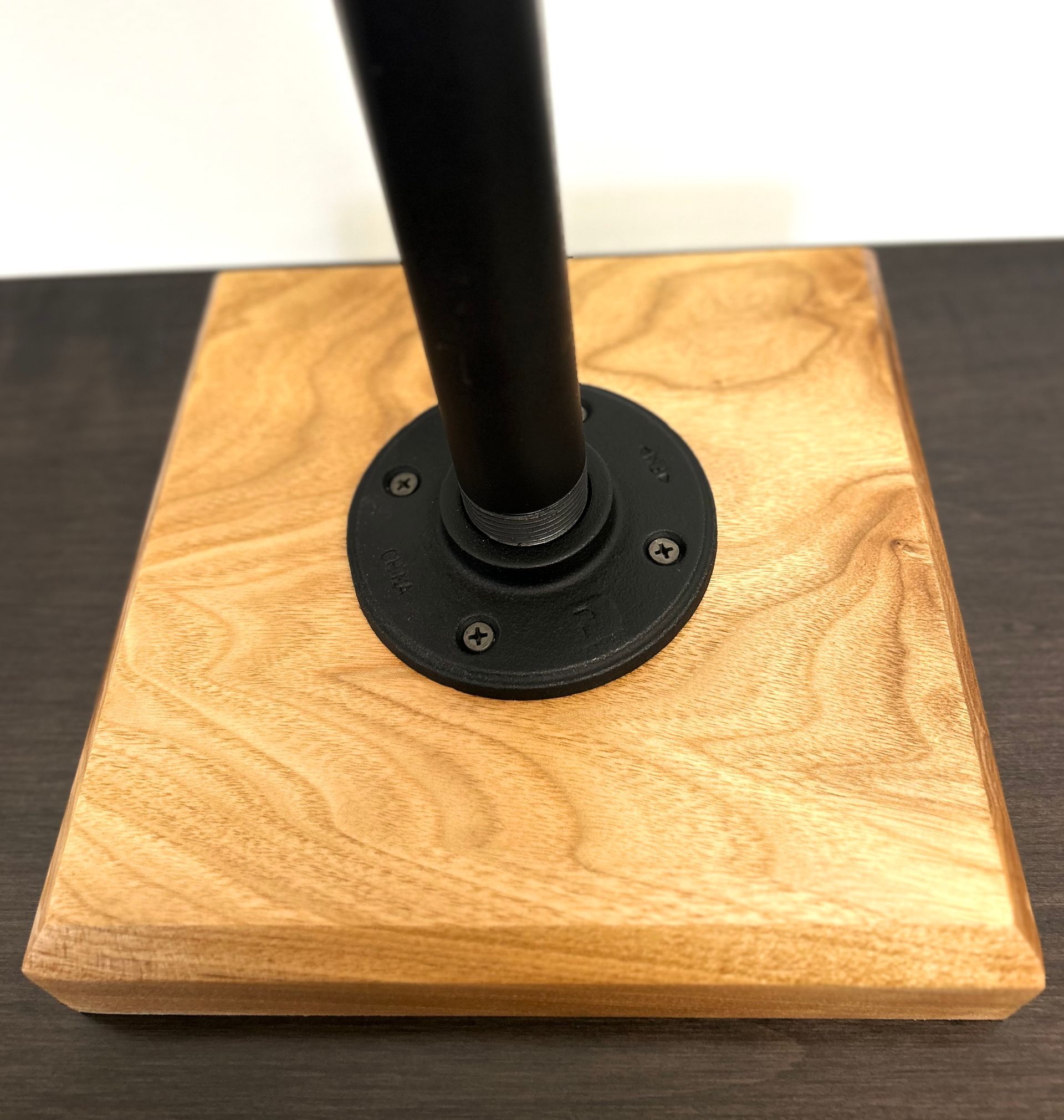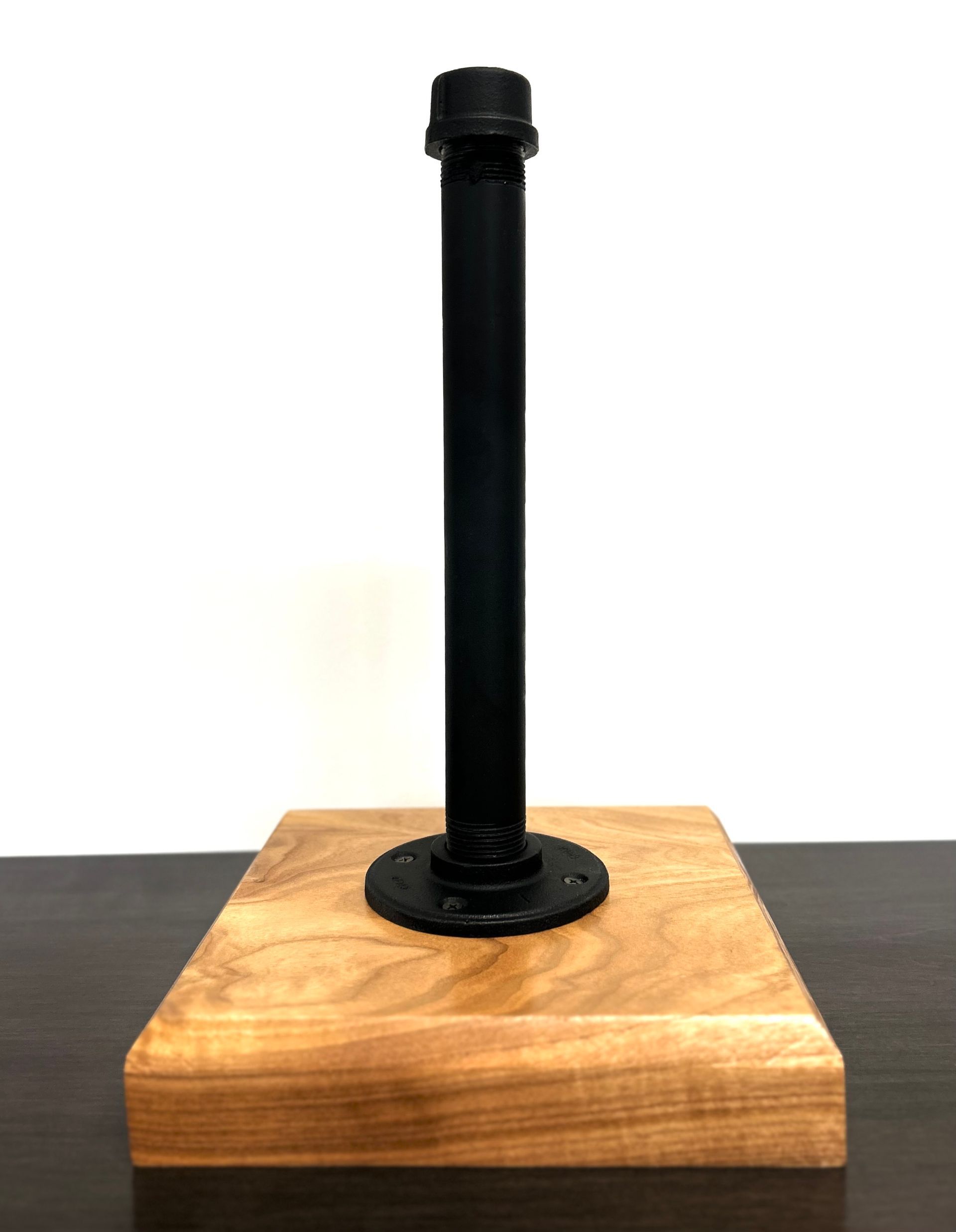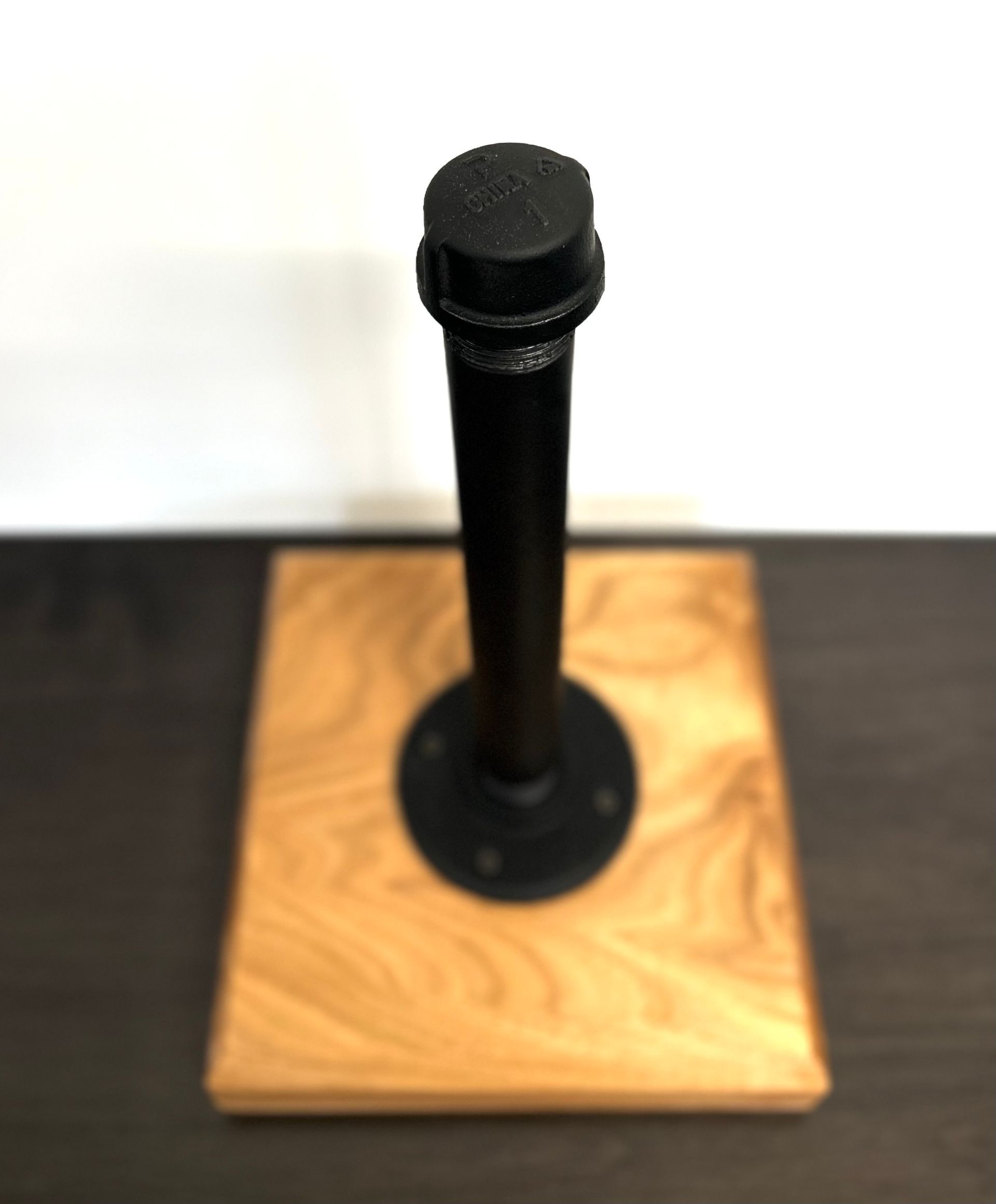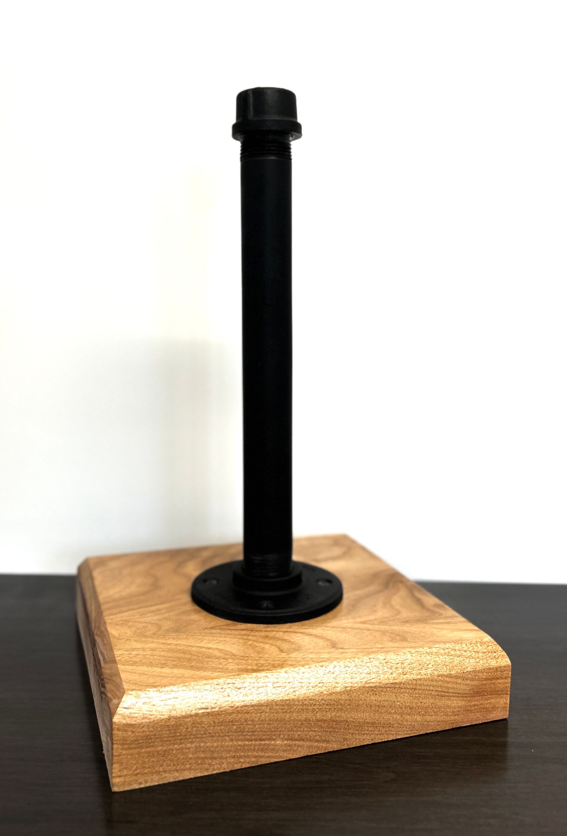 This paper towel holder is made of steel pipe painted with a flat black paint mounted on your choice of oak, black walnut, or cherry. All Appalachian hardwoods and of cabinet quality. The base is thick and sturdy to accommodate the unraveling of the towels. All come with a clear coat finish to exemplify the natural grains of the wood. Delivery will occur within two weeks since every job is made to order. The cost with shipping is $100.00.