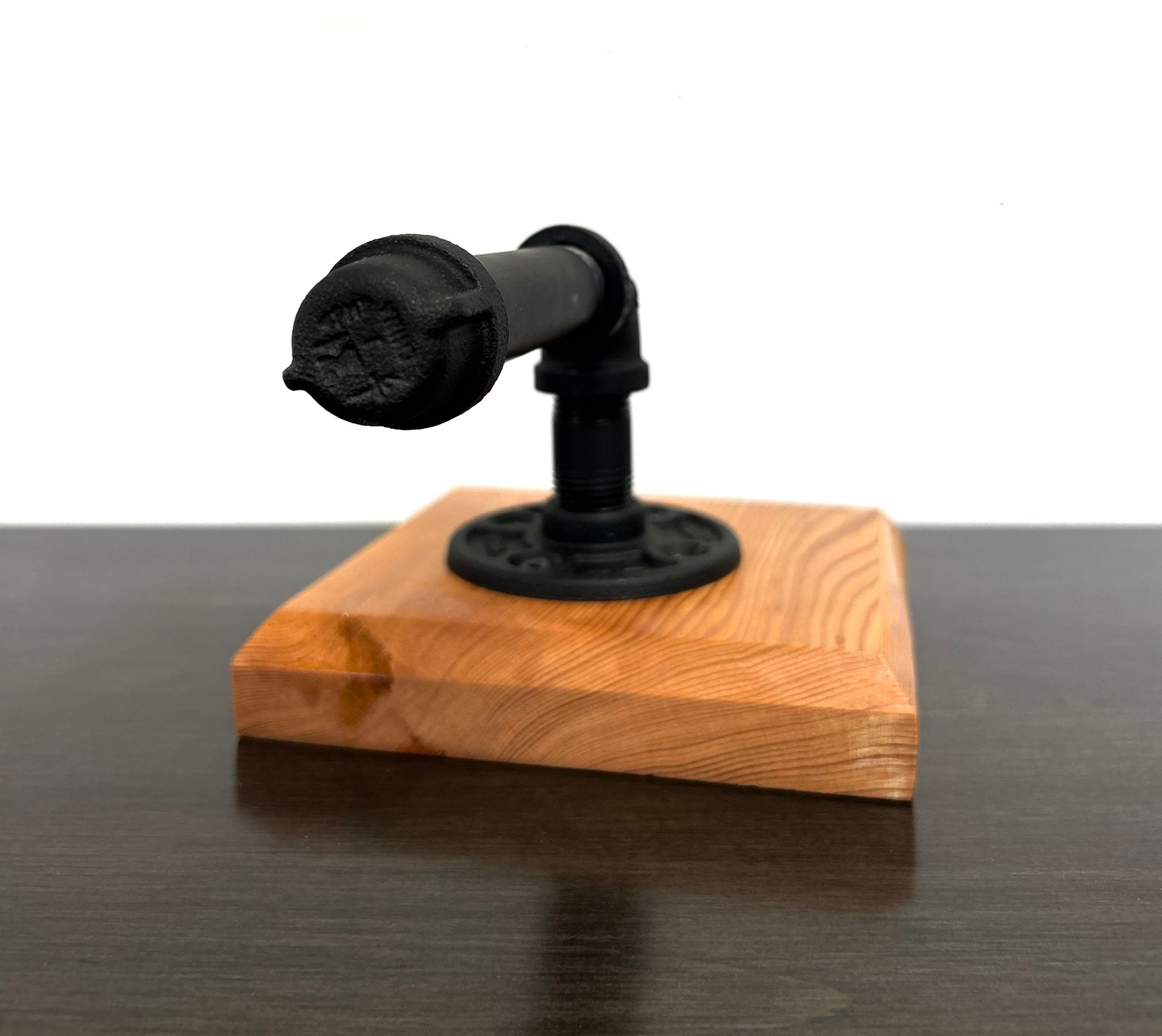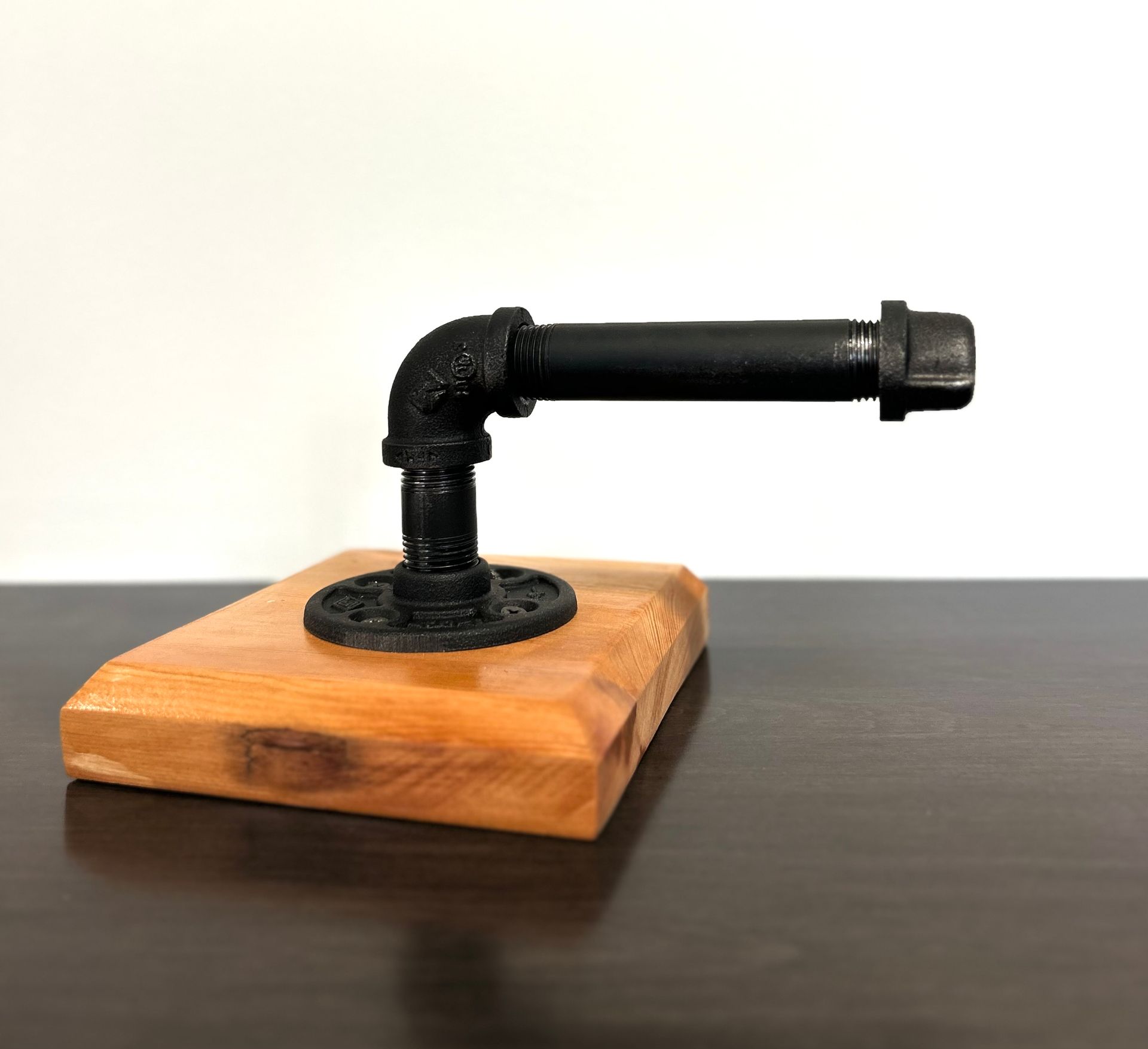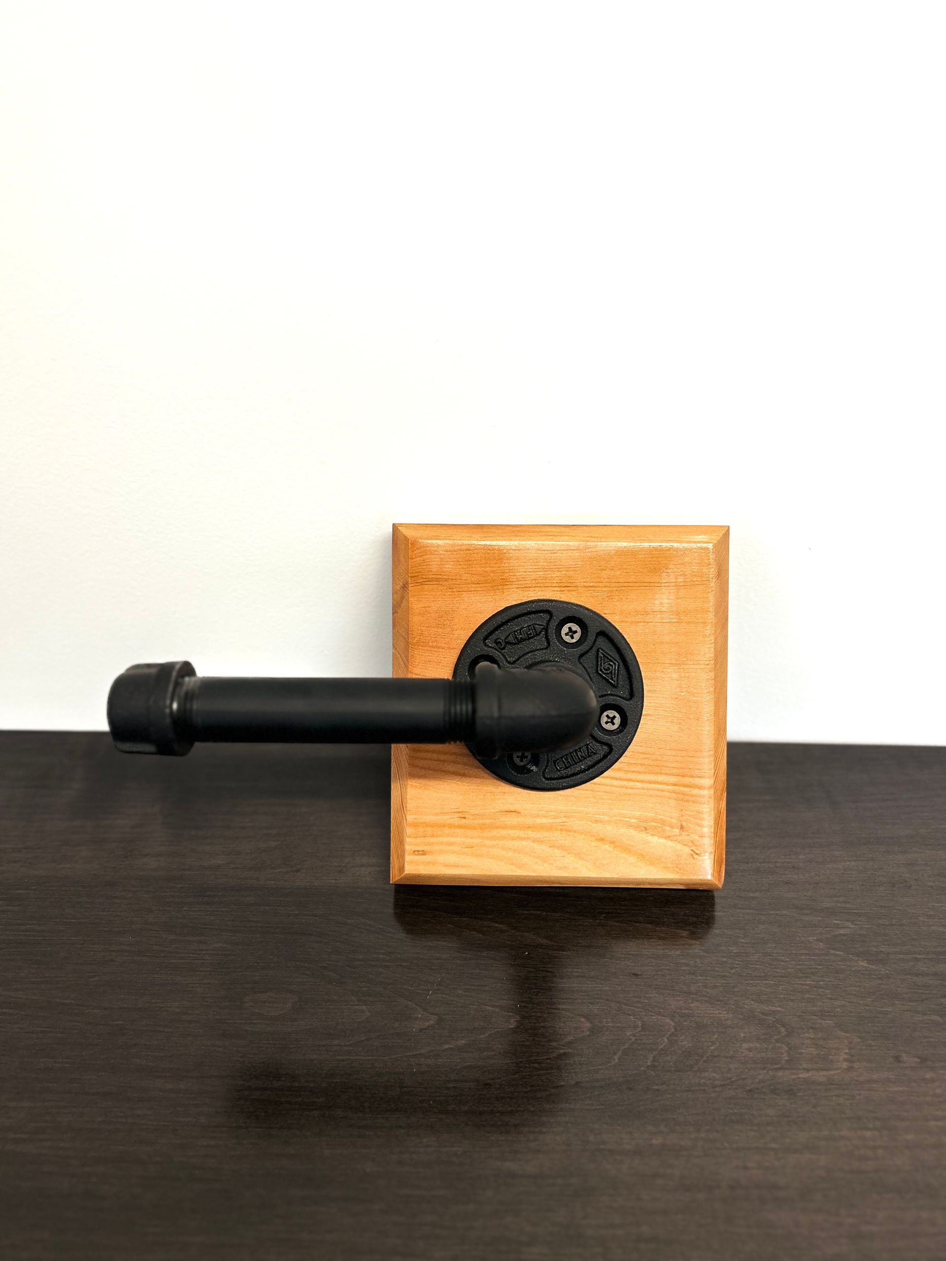This toilet paper holder is made of steel pipe painted with a flat black paint mounted on your choice of oak, black walnut, or cherry.